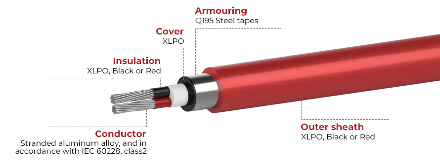 3. Mantel: De mantel van deze kabel is gemaakt van XLPO dat bestand is tegen langdurige blootstelling aan zonlicht en buitenomstandigheden. Deze UV-bestendigheid is cruciaal om de prestaties van de kabels te behouden en degradatie in de loop van de tijd te voorkomen.