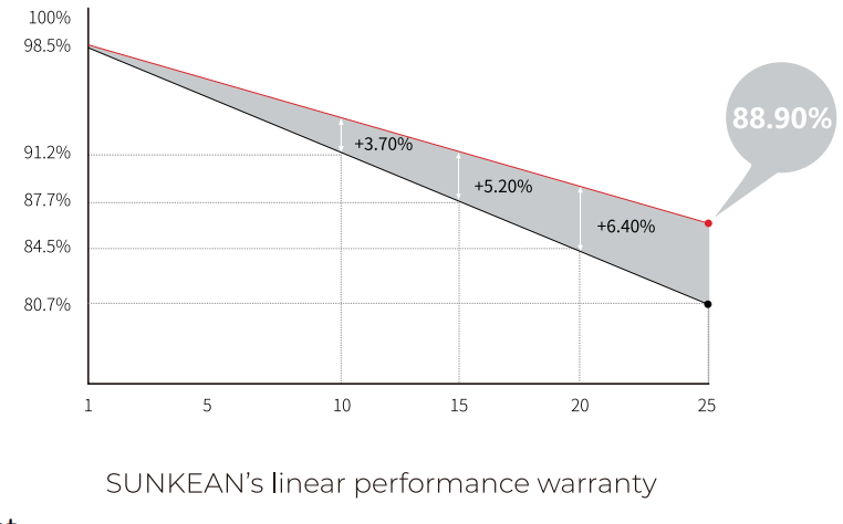 De zonnepanelen van Sunkean, ontworpen voor Europese daken , zijn uitstekend bestand tegen door potentiaal veroorzaakte verzwakking, zoals hieronder wordt aangetoond. Door dit vermogen heeft dit zonnepaneel een minimale levensduur van 25 jaar.