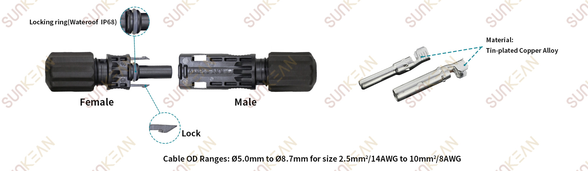 de h4 plus-connector geleverd door SUNKEAN is een robuuste, dual-gecertificeerde DC-connector met UL 6703 1500V & IEC 62852 (ed.1); am 1 1500V (klasse A) specificaties en certificeringen. als een evolutie van H4-connector, de H4 plus-connector omvat uitstekende duurzaamheid, amphenol-compatibele paringconfiguratie, amphenol's lage weerstand RADSOK®-contacttechnologie, mogelijkheid om draaddiktes te accepteren van 14awg/2.5mm² tot 8awg/10mm², en een IP68-classificatie. verbeteringen ten opzichte van de H4 inbegrepen in de H4 plus-connectoren zijn een ratelwartelmoer, die eenmalig terugdraaien voorkomt de moer is vastgedraaid, een verbeterde afdichtingsring voor nog betere prestaties bij natte lekkage, en een geoptimaliseerd contactontwerp voor uitstekende stabiliteit op lange termijn. door gebruik te maken van pakkingmoeren, omgevingspakkingen, spantangen voor de draadbevestiging, en contacten die meerdere draaddiktes accepteren, wordt verminderd en er worden echte kostenbesparingen gegenereerd.