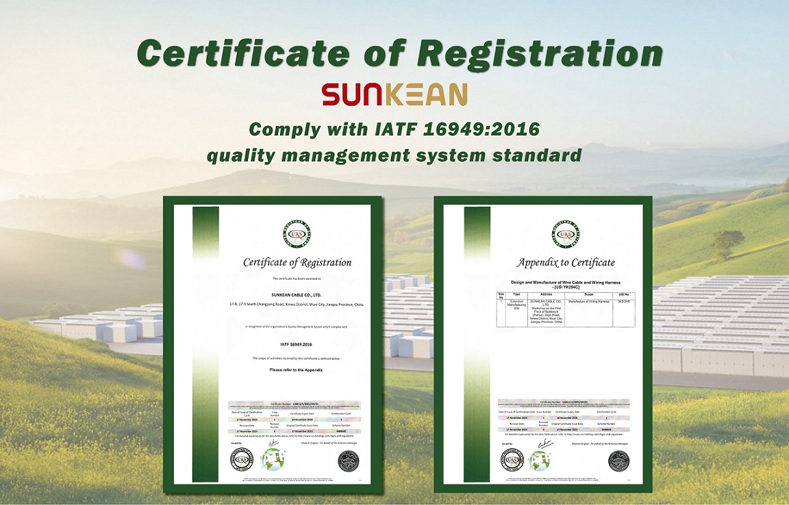 IATF16949- certificering is een kwaliteitsmanagementsysteemstandaard ontwikkeld door de International Automotive Task Force (IATF) en vertegenwoordigt de hoogste kwaliteitsstandaard in de auto-industrie wereldwijd. Kort na het winnen van 's werelds eerste nieuwe versie van het TUV Rheinland energieopslagkabelcertificaat, won SUNKEAN de IATF16949- certificering en raakte de "SUNKEAN Speed" opnieuw op.