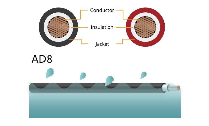 Kabels met beschermingsklasse AD8 zijn voor onbepaalde tijd bestand tegen onderdompeling in water. Als de kabels in de zonne-energie-installatie gedurende langere tijd niet in water worden ondergedompeld, moeten AD7-kabels worden gekozen.