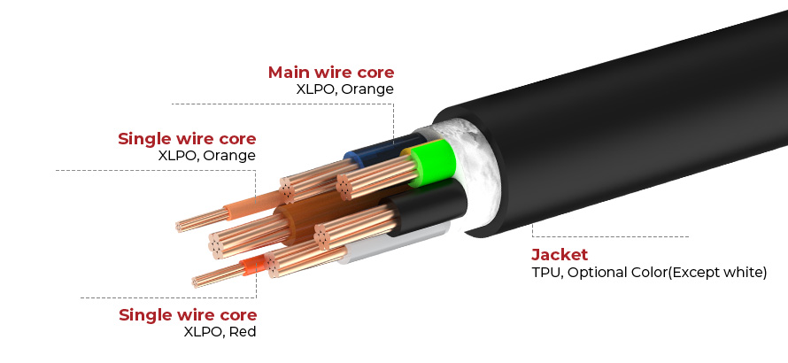 XLPO Hoofdkern: blauw, bruin, zwart, grijs, geel en groen Enkele draadkern: oranje, rood |