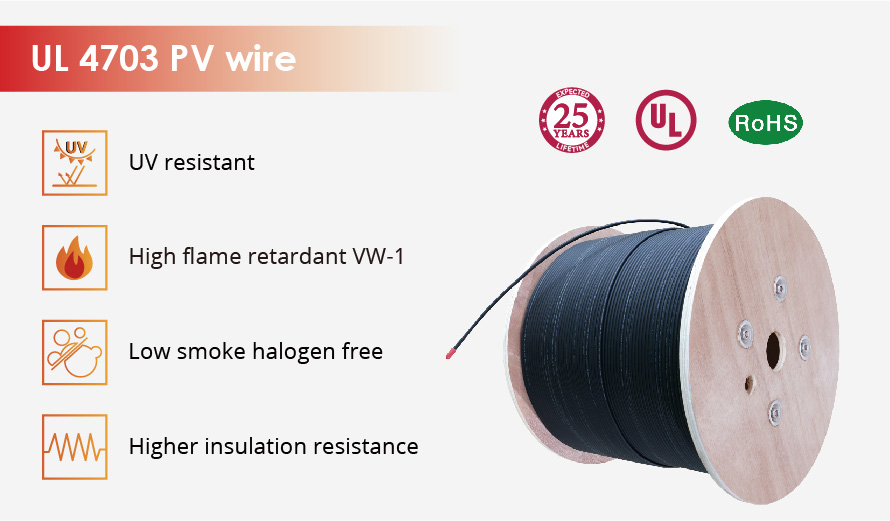 De UL 4703 heeft blanke koperen geleiders en dubbellaagse XLPO-isolatie en is geschikt voor toepassingen tot 2000 volt en temperaturen van -40°C tot +90°C, nat of droog.
