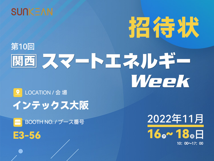 Van 16 tot 18 november 2022 zal de World Smart Energy Week OSAKA 2022 worden gehouden in het INTEX International Exhibition Centre in Osaka, Japan, en SUNKEAN zal deelnemen zoals gepland.